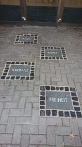 Ebenfalls spontan erfolgte ein Rundgang durch das Schulgebäude, der auch die Denksteine am Haupteingang, die wesentliche Werte unserer Schule in Stein festhalten, beinhaltete.