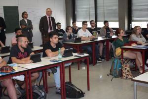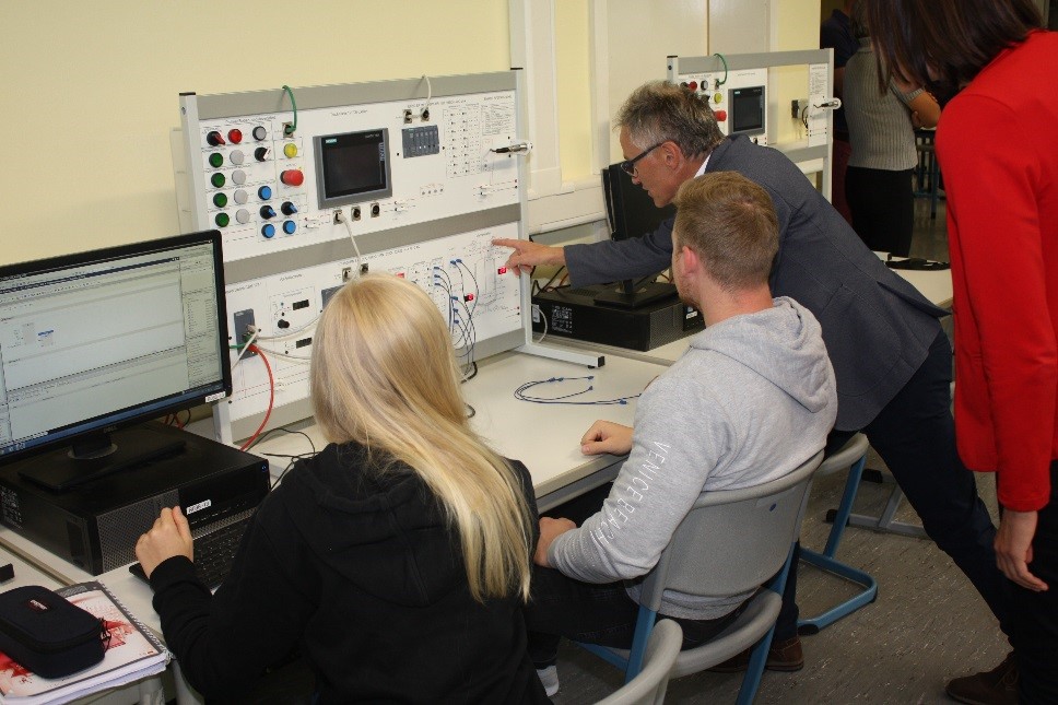 Herr Kessler besuchte eine Klasse von Elektronikern Fachrichtung Automatisierungstechnik im 3. Ausbildungsjahr, die an praxisnaher Siemens Automationstechnik in Schule und BASF ausgebildet werden. Die Teilnehmer kamen mit Schülern und Lehrkräften ins Gespräch; dabei wurde unter anderem auch der Anspruch digitaler Kern- und Fachkompetenzen im Lehrplan und der Ausbildung beim dualen Partner angesprochen, der jedoch in den Abschlussprüfungen bisher keinen Widerhall gefunden hat.