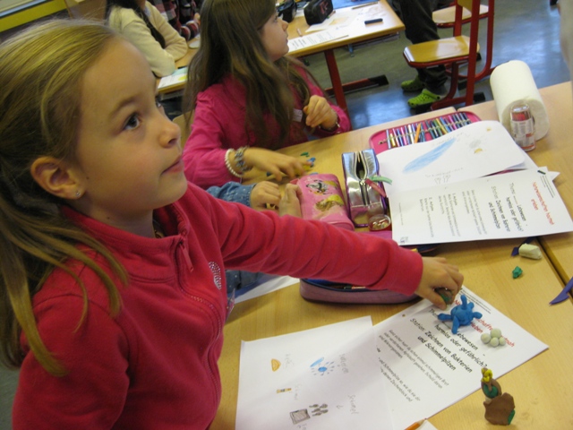 Um das herauszufinden, durften die Grundschulkinder malen und ihre Lieblingsbakterien aus bunter Knete modellieren. Der überwiegende Teil der Kinder malte die Hefe als Quadrat, während beim Formen der Knetbakterien die bizarrsten Phantasiegebilde entstanden, beispielsweise „Baktoman“, ein Bakterium mit grünem Umhang.