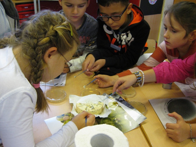 Sie erfuhren durch Rechnen, Experimentieren, Zeichnen, Zeichnungen beschriften, Arbeitsanleitungen Lesen und Umsetzen, Ergebnissicherung durch Dokumentieren in ihr Projektheft und nicht zuletzt durch die Merksätze, dass Bakterien, Schimmelpilze und Hefepilze zu den Mikroorganismen zählen, mikrowinzigklein sind, eine hohe Vermehrungsrate haben und praktisch überall vorkommen. Ferner konnten die Grundschüler beobachten, dass Edelschimmel im Käse lebt. Dazu haben sie den Blauschimmel aus dem Käse gepuhlt und mittels Impföse auf einer Agarplatte ausgestrichen. Eine ganze Woche durften sie jeden Tag nachschauen ob der Pilz gewachsen ist. Sie wissen jetzt, dass Schimmel nicht gleich Schimmel ist, weshalb verschimmelte Früchte, Brot und andere Lebensmittel auf keinen Fall gegessen werden dürfen, da die Pilze Giftstoffe herstellen, die uns schaden. Anderseits gibt es auch Schimmelpilze, die Antibiotika bilden und das, so wusste Tuwanon, „ist echt gut für uns.“