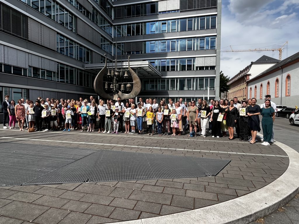 Die Umsetzung der Demokratiebildung, der Umweltbildung sowie auch die Bezüge zu wirtschaftlichen und gesundheitlichen Aspekten überzeugten die Bildungsministerin Frau Dr. Hubig und die Landes-SchülerInnen-Vertretung. Daher haben Benedikt Seif als Vertreter der Schulleitung und Sebastian Wiedmann als Nachhaltigkeitsbeauftragter die Plakette für die Schule überreicht bekommen.