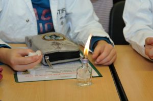 Leo Leichsenring und Nico Pfeifer begrüßten die 20 Grundschüler der Klasse 3b und führten sie in den Projektaufbau von „Naturwissenschaften hautnah erleben“ am 16.11.2016 in der Domholzschule ein. Jede Schülerin und jeder Schüler erhielten einen Forscherkittel und einen Schnellhefter für die Arbeitsblätter, dann konnte es losgehen.