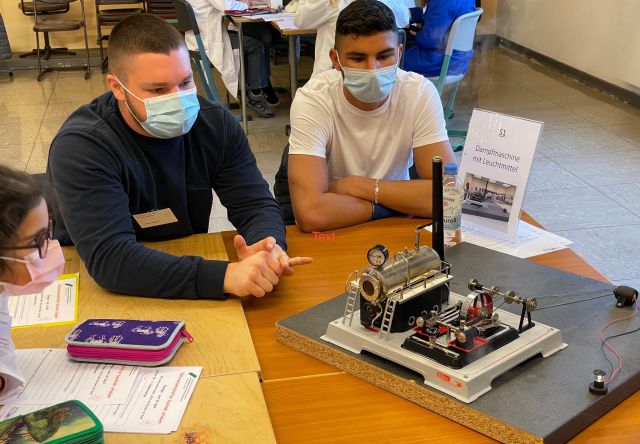 Bei der Dampfmaschine, eine Station weiter, fanden sich Berufsschüler zusammen, für die es zu Beginn eine große Herausforderung war, die Komplexität der Energieumwandlung einer Dampfmaschine zu begreifen und noch zusätzlich auf Grundschulniveau aufzuarbeiten. Doch jetzt, im scharfen Durchgang, ist die Hemmung wegen der Komplexität, nach kleinen Anfangsschwierigkeiten, verschwunden und es wird fleißig erklärt, beschrieben und über Druck, Kraft und Kolbenhub gefachsimpelt.