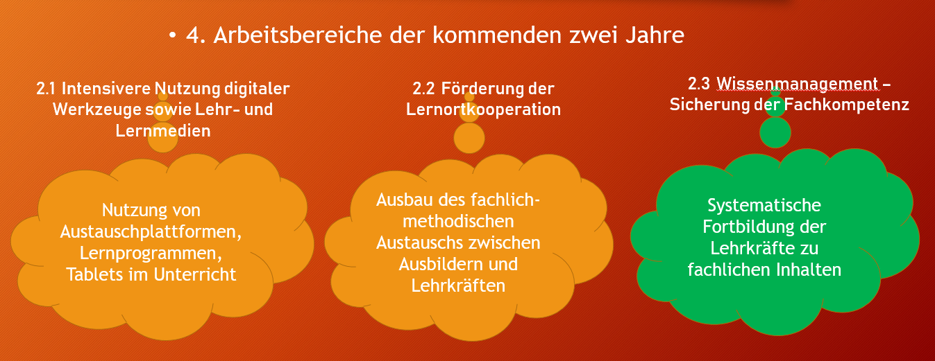- Planung und Organisation von Fortbildungsangeboten für Lehrkräfte und Ausbilder und Etablierung von pädagogischen Nachmittagen und „best practise“ Veranstaltungen